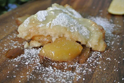 All this one takes is a brief saute and a quick spin with the immersion blender to produce a silky batter that's poured over the simply spiced apples. It quickly bakes up moist and gently chewy, something like a dumpling. The apples are cooked quickly so they keep some bite to contrast with the soft dough. A squeeze of lemon and a dusting of sugar provide an elegant finish.