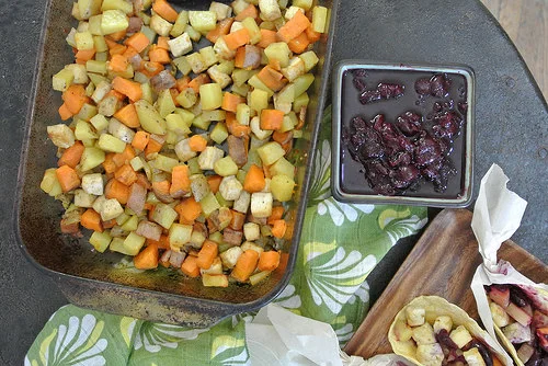 To serve: Pour the sauce over the roasted potatoes and stir well. Some of the potatoes will mash a bit during this process, and that's okay. Good, actually. Keep the potatoes warm in a low oven (no higher than 200) while you prepare your tortillas so the mixture can continue to thicken [see Note]. Assemble tacos immediately and top with the three-pepper relish.