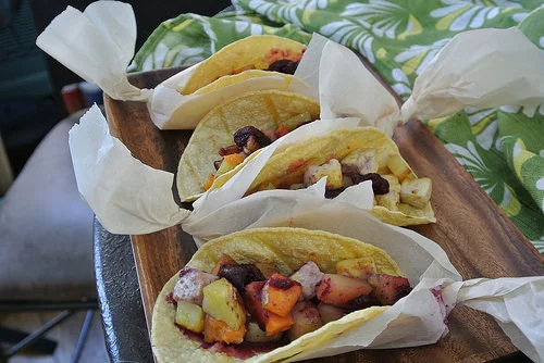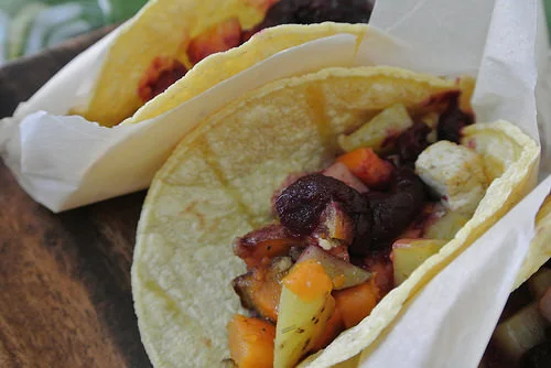 [Note: Fresh tortillas are always recommended (that's a variation on the recipe we make from Viva Vegan!). Tacos are good, but they become seriously great when you take the extra time to make a batch of tortillas right before digging in. But here's the important part: The thicker sauce that results from sitting in the low oven for the additional 15-20 minutes it takes to make the tortillas is a filling much more fitting for a handheld foodstuff. Without thickening, the sauce would probably be too messy for tacos.